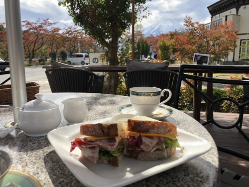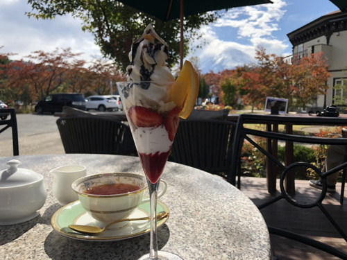 まずは河口湖でランチです。景色の良さそうなテラス席があるとの事で、「オルソンサンのいちご」というお店に伺いました。サンドイッチとトルティーヤ、そしてバルサミコソースのかかった大人パフェを注文させて頂いたのですが、どれもとっても美味しかったです。そして、目の前には富士山!なんて贅沢♪