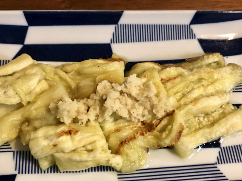 焼き茄子にしょうがを添えて。旨味と甘味が凝縮されてます。とろっとろ♪