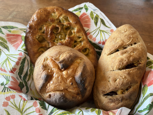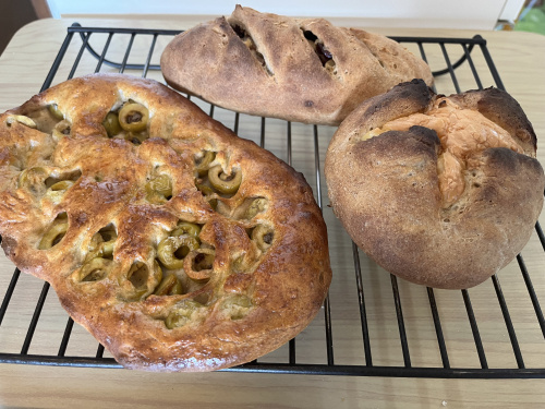 3種類のパンを焼きました☆最近ハマっているオリーブのフーガス、チーズクッペ、クランベリーとクルミのライ麦パン。