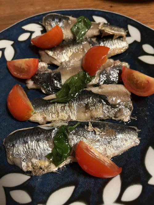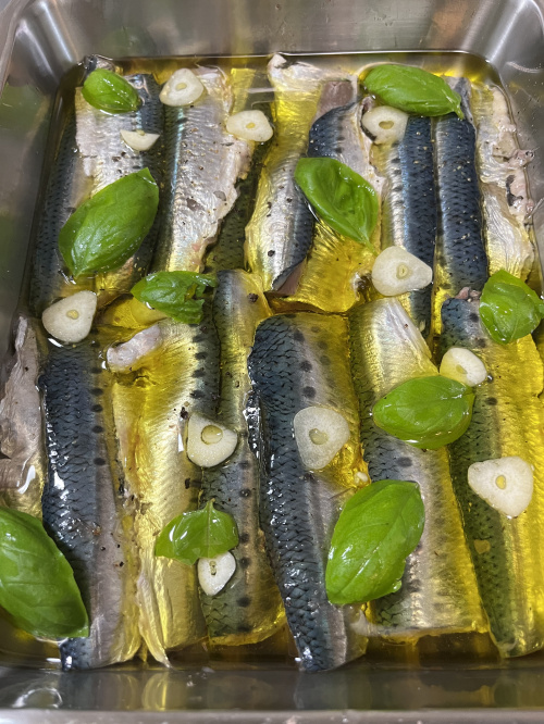 三枚におろしたイワシをオリーブオイル、にんにく、バジルでマリネしました。