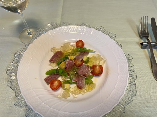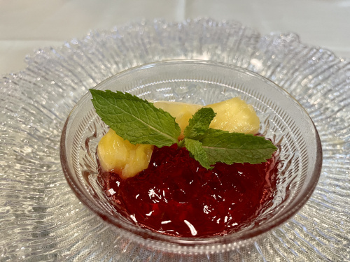 デザートは、クランベリーのゼリーとフレッシュパイナップル。後から気が付きましたが、何故だかクランベリーがかぶりました!!寒色系の中に鮮やかな赤が欲しかったのでしょうか。