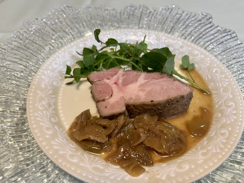 二品目は低温調理した豚肩ロース。作ってから3日ほど冷蔵庫で寝かせ、食べる時にほんのり温かい程度に温めました。低温調理&寝かせる事でとっても柔らかくジューシーに仕上がります♪自宅のベランダ産のクレソンを添えました。