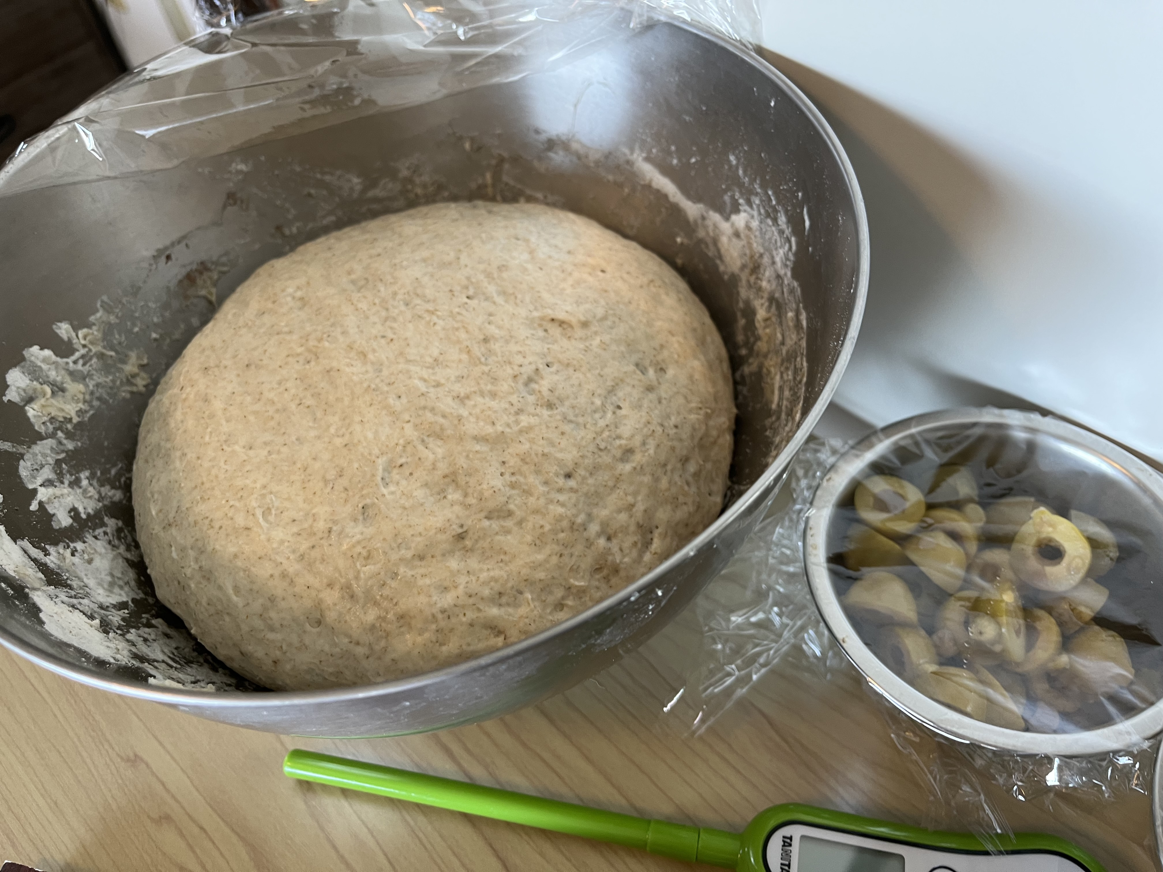 一次発酵が終わったところです。1時間ほどで倍以上の大きさになりました。