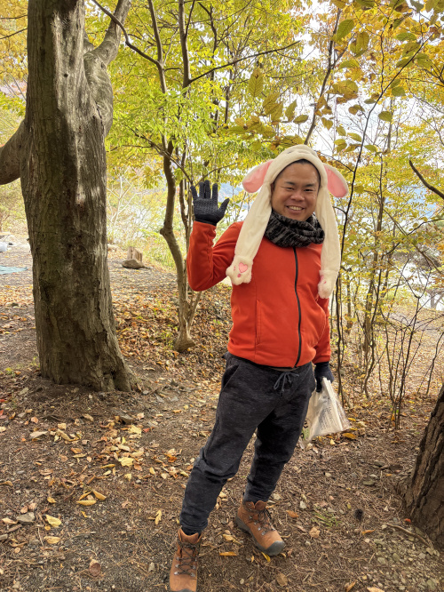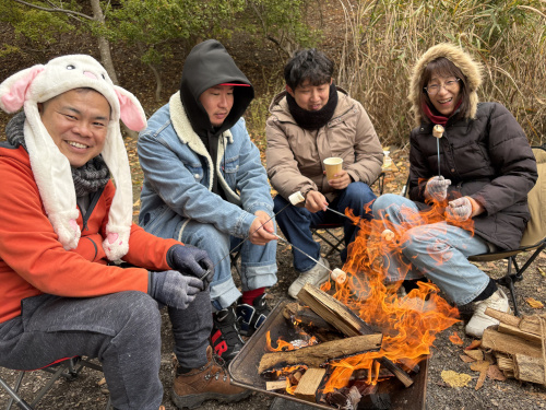 焚火したらこれはやらなくちゃ第1位!!マシュマロ焼き☆すっかり板についてきたウサギ健♪本当は、寒くてもうこの帽子を脱げないのです!