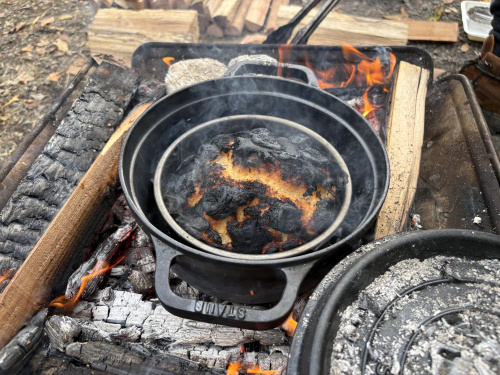 ダッチオーブンの蓋の上に置いた炭が多すぎて温度が上がりすぎました!!!あーあ、焦げちゃったー