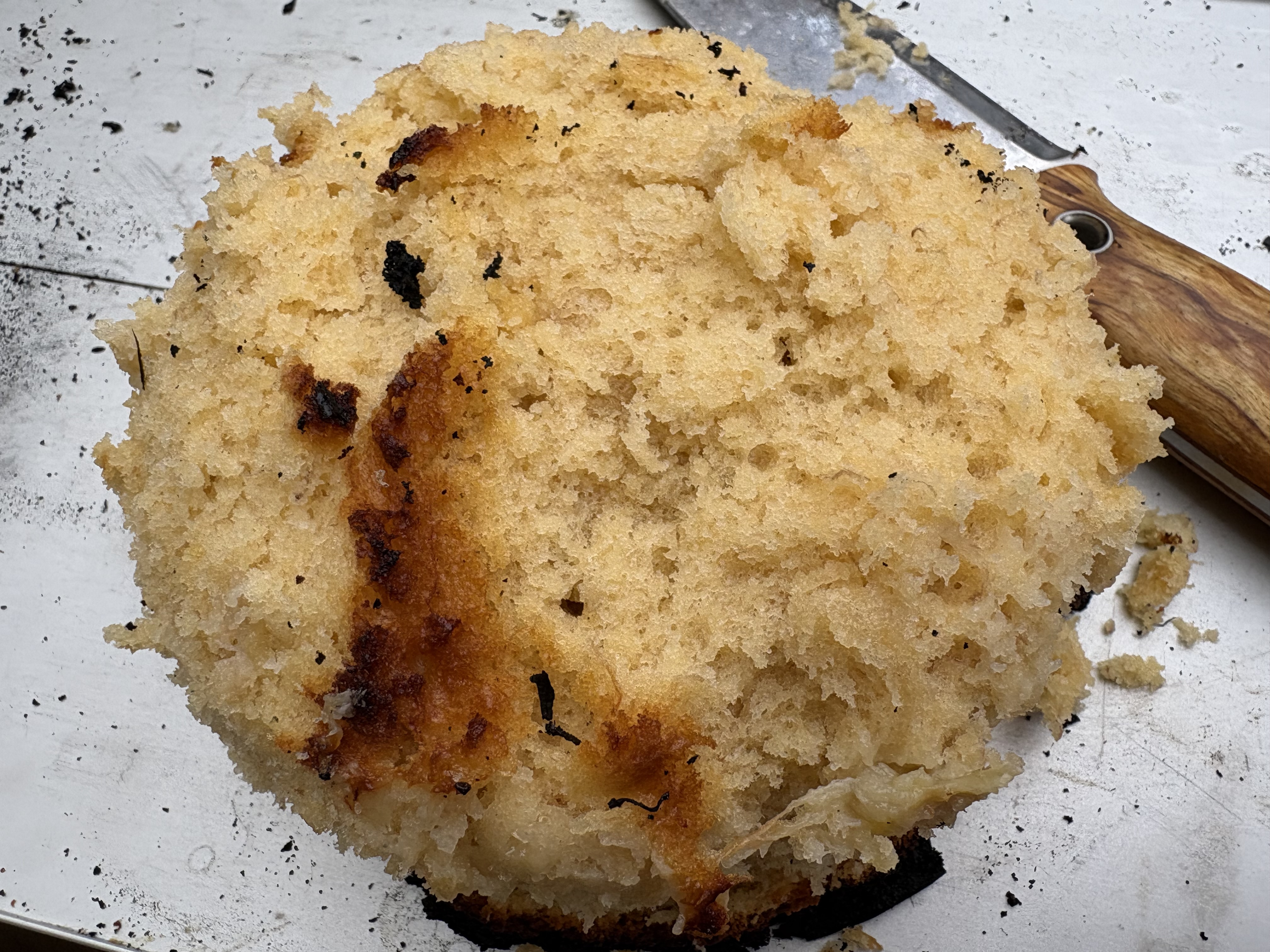 勿体ないので、焦げた部分を削って食べました☆ま、そんな事もあります!キャンプだもの♪ふわふわで美味しかったです☆