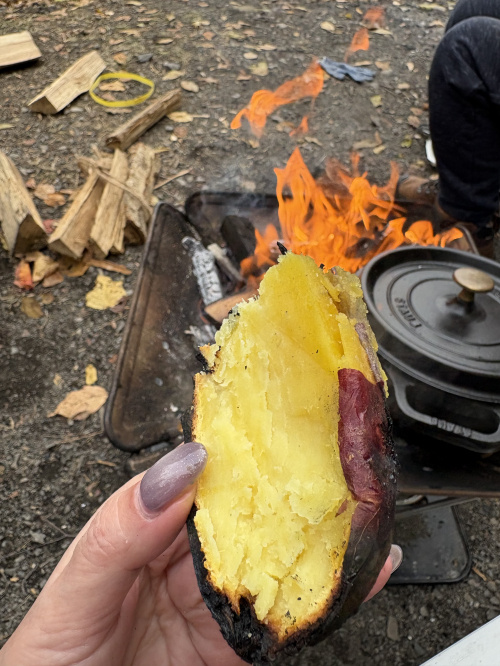 焼き芋もやらなくちゃ!いくら食べても太らない魔法の身体を持つ江成が「別腹☆」と言って完食!「いやいや、あなたの場合は、ブラックホール腹でしょ」と突っ込みたくなります。