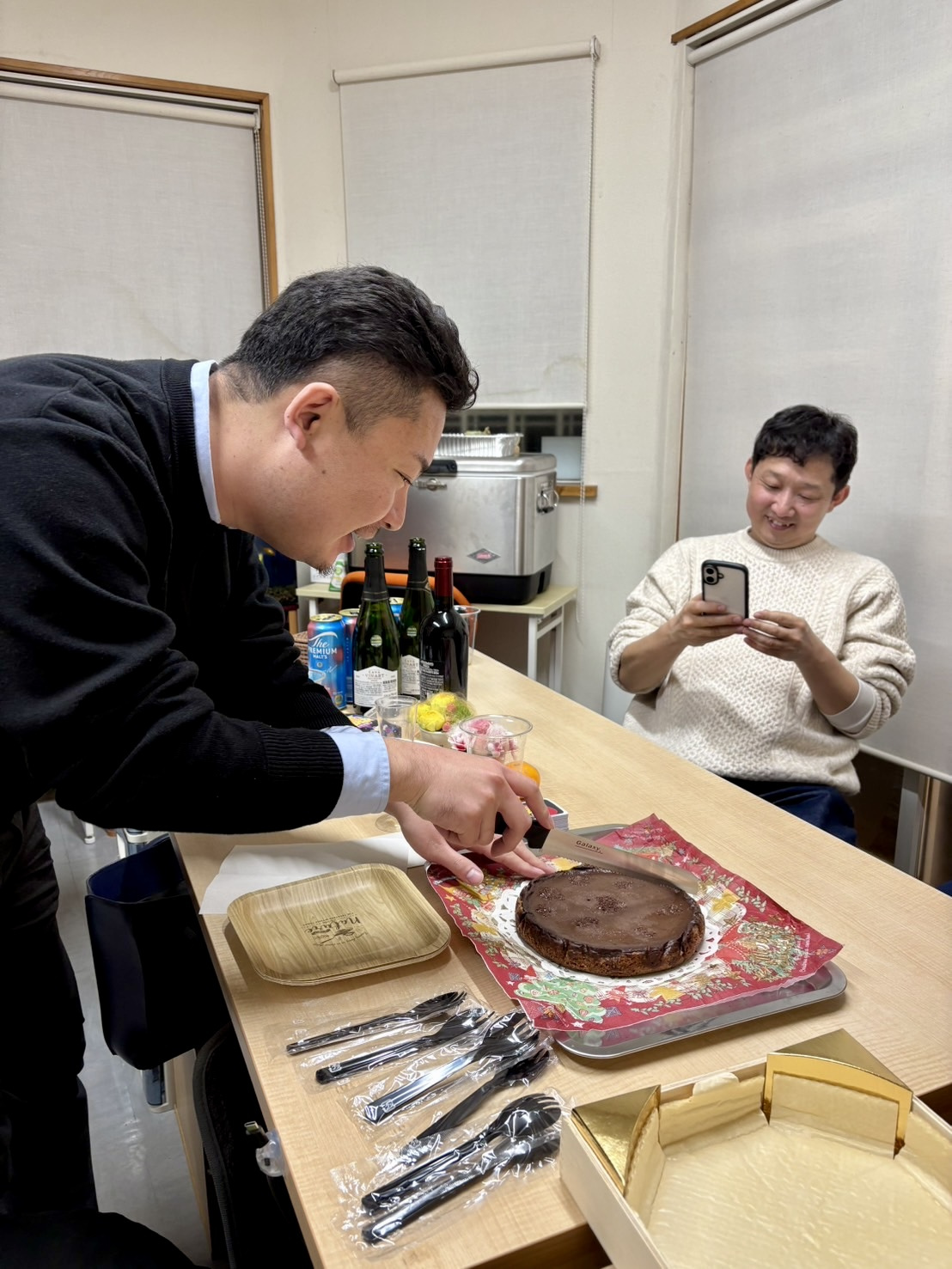 今回はなんと!!武が濃厚絶品チョコレートケーキを作ってきてくれました!甘さもちょうどよく、もー最高の出来です!!みんな大喜び♪♪料理男子の一面も持ち合わせるスタッフなのです♪